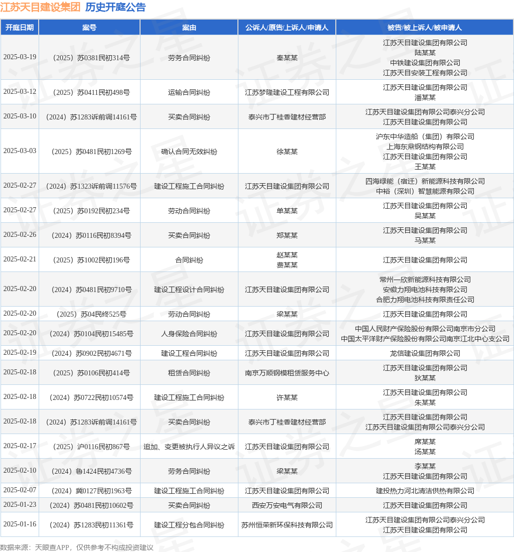 案号:(2024)苏0902民初4671号审理法院:盐城市亭湖区人民法院案由:建设工程合同纠纷当事人信息: 原告/上诉人:江苏天目建设集团有限公司 被告/被上诉人:龙信建设集团有限公司开庭日期:2025年2月19日根据统计,近一年内以江苏天目建设集团有限公司为当事人的历史开庭公告有199则,其中案由为“建设工程施工合同纠纷”的公告以65则居首,其次为“买卖合同纠纷”有20则,“劳务合同纠纷”有18则。历史开庭公告(前20条)如下: